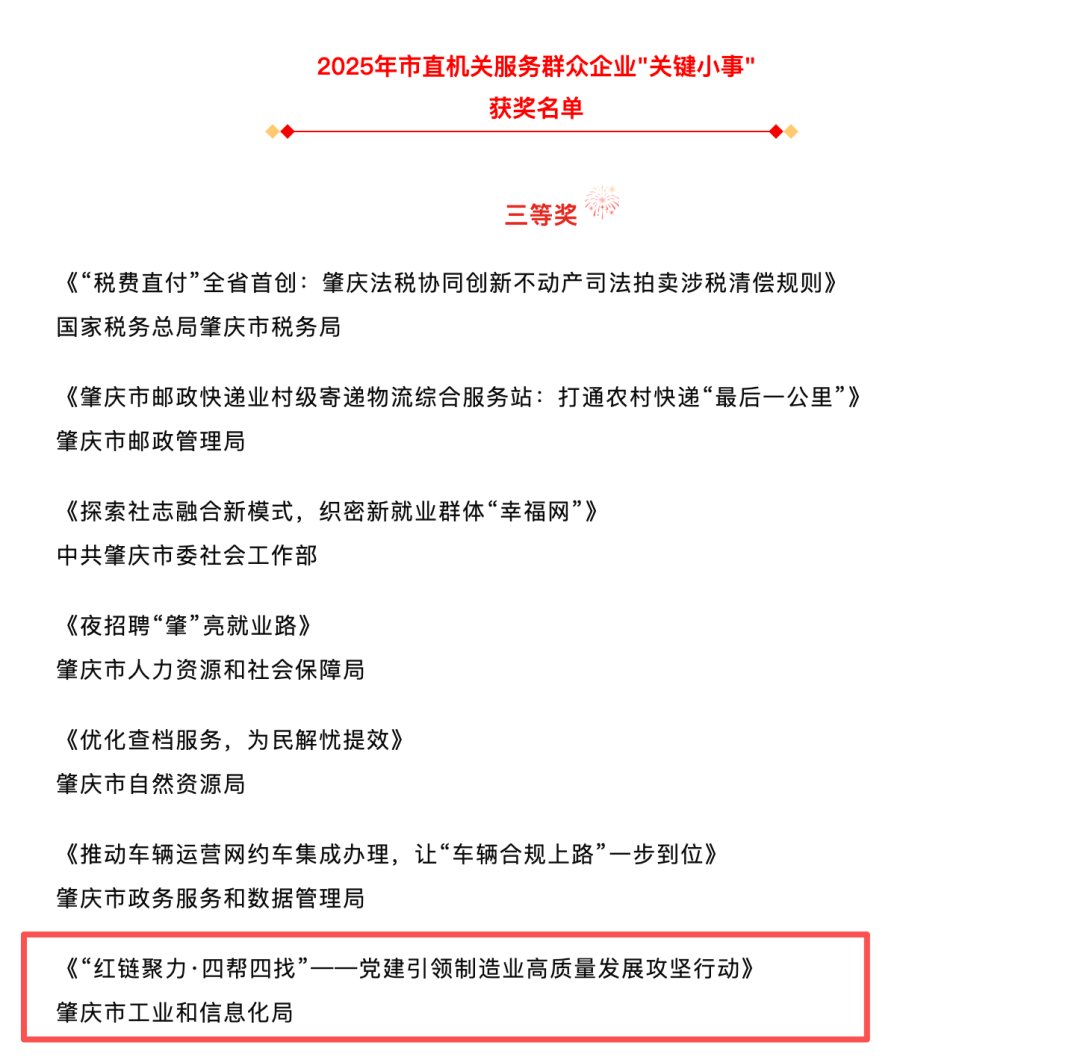 该项目同步获第四届肇庆市“西江杯”工做立异大赛党建赋能类一等,肇庆市工业和消息化局被授予“优良组织”。